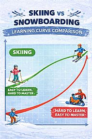 Snowboarding takes longer to feel comfortable, but once it does, many people find it easier to progress and more playful than skiing.