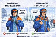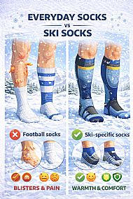 When I was a chalet host, a young boy turned up wearing football socks. By the end of his first day skiing, the pattern of the socks had turned into tiny blisters all over his legs.
