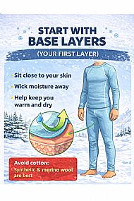 This is important because beginners often work harder than they expect—getting up, falling over, and standing back up. You will sweat, and base layers stop that sweat from making you cold later.