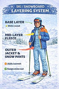 Getting your clothing right can be the difference between a great first day on the slopes and a very cold, uncomfortable one. The good news? You don’t need to overthink it — you just need to layer correctly.