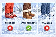 Some hire shops will require you to return the boots at the end of the day, including snowboard boots (do not use snowboard boots to walk around; it's not cool), so make sure you have Après Boots with you.